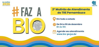 O Tribunal Regional Eleitoral de Pernambuco (TRE-PE) promoverá, nos dias 4, 5 e 6 de dezembro, o 2º mutirão de atendimento para cadastramento biométrico